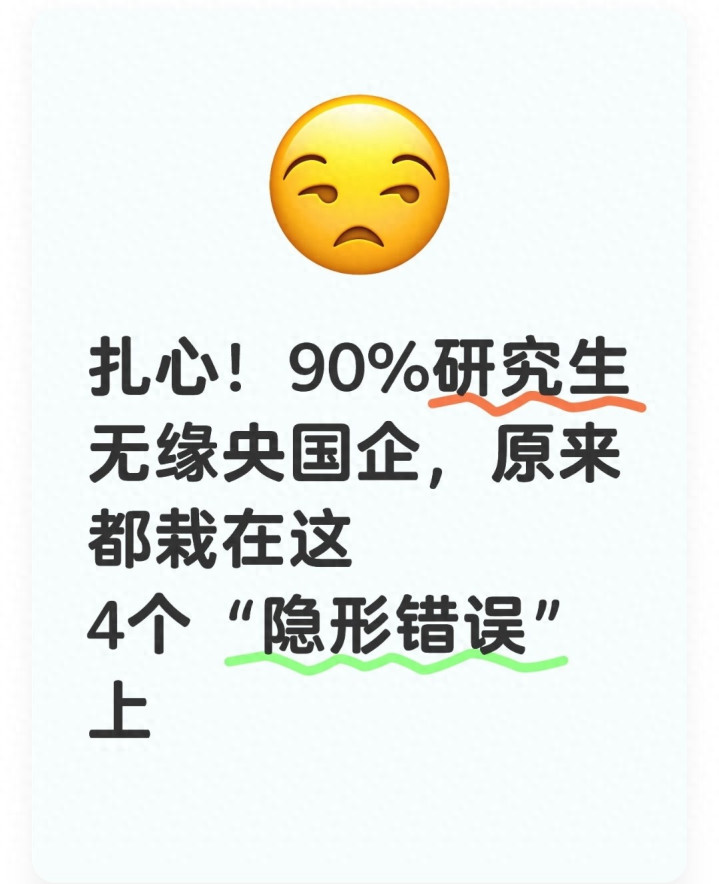 当下不少研究生把央国企当作就业首选,稳定体面、待遇扎实,发展路径清晰,可现实却很扎心,九成研究生拼到最后还是无缘上岸,不是学历不够硬,也不是能力不达标,大多是栽在了几个容易忽视的隐形错误上,踩一个就容易错失机会,看完这些才能少走弯路。