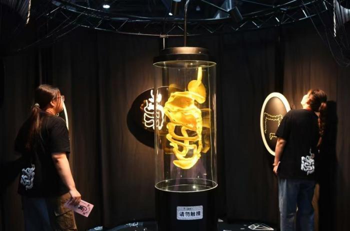 展厅设置巨型嘴巴艺术装置、7部影像装置、9处经典互动实验,观众可亲手拼接7米肠道模型、触摸粪便模拟样本、互动探索肠道微生物、模拟无菌舱科研操作,在游戏化、沉浸式体验中轻松掌握肠道健康知识,真正实现“玩中学、学中悟”。