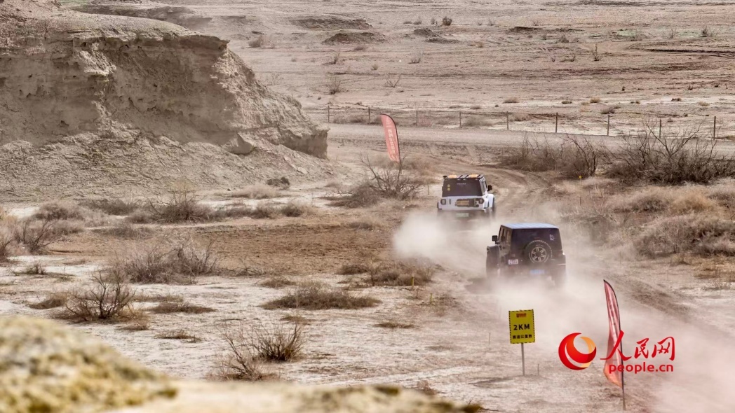 世界魔鬼城景区达喀尔营地热闹非凡,游客体验越野赛道。人民网 李龙摄