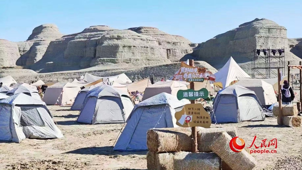 露营大会作为核心体验项目,以雅丹地貌为天然背景,用帐篷集结打造的公共社交空间,轻松玩转户外乐趣。人民网 李龙摄